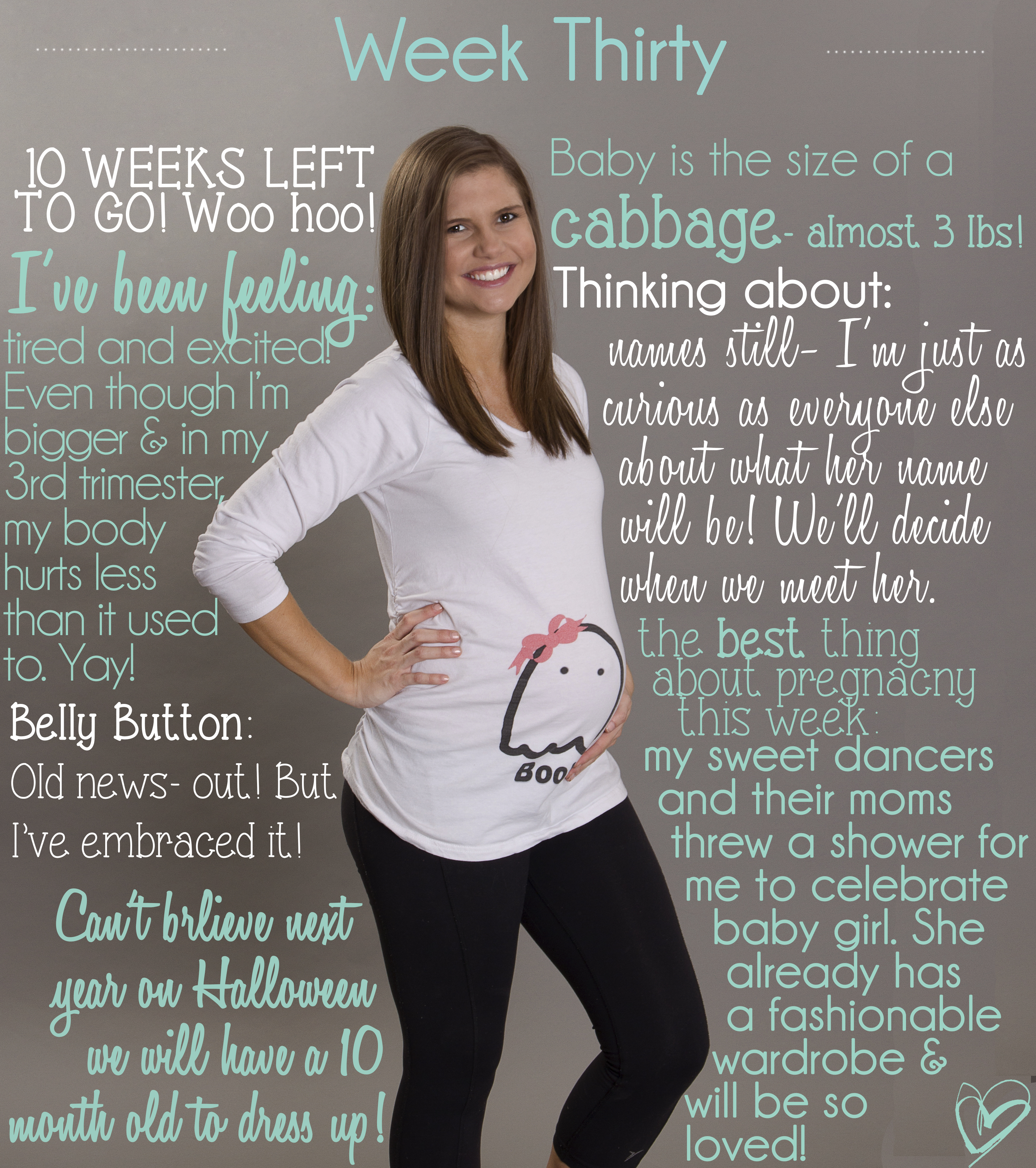 We are at the 30 week mark, which means that after this week we are in single digits for the countdown. I am so excited that it is getting closer, but feeling like I need to cherish every last minute of being pregnant. I have so enjoyed being pregnant (minus those first 12-13 weeks of being SO SICK!) and feel a little sad to see it coming to an end. Ok, so I know I still have 10 weeks, I just know those 10 weeks are going to go very very fast. So here’s to enjoying every day, no matter what! (Will you remind me of that when I’m so big and fat that I can barely walk around at the end?)